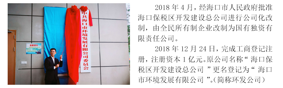 海口市環境發展有限公司是??谑袑賴歇氋Y有限責任公司,于2018年12月正式掛牌運營,注冊資本1億元,由1993年12月成立的海口保稅區開發建設總公司進行公司化改制而成,核心業務為環境環衛產業投資和運營、資產運營和管理,培育業務為工程管理